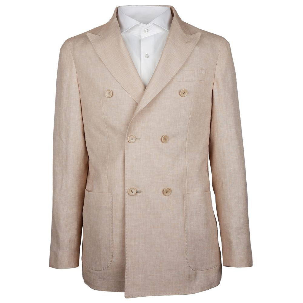 Loro Piana Fabric Summertime double-breasted natural color linen-wool blend jacket with peaked lapels, two front pockets and breast pocket, two inside pockets